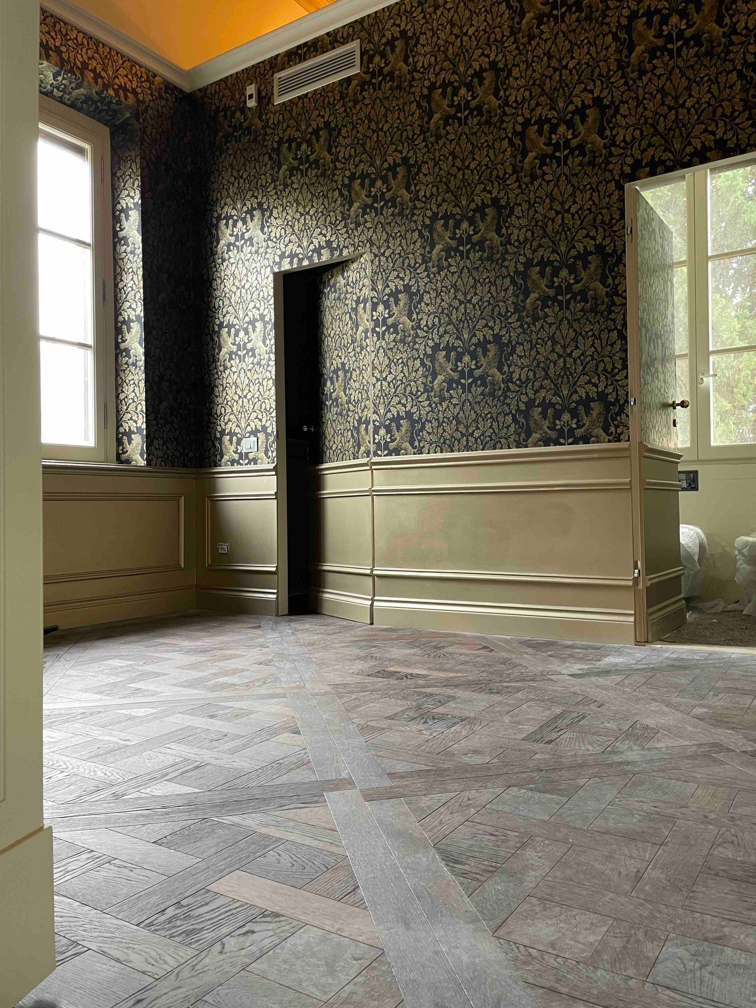 Le boiserie in gesso sono eleganti decorazioni murali che rivestono le pareti e conferiscono agli ambienti un’atmosfera raffinata e classica. Realizzate con elementi in gesso, queste boiserie riproducono l’aspetto delle pannellature tradizionali in legno, ma sono più leggere e offrono una maggiore libertà creativa nelle forme e nei dettagli. In una boiserie completa, si distinguono diversi componenti quali: Battiscopa, marcapiano, quadri bassi e quadri alti.