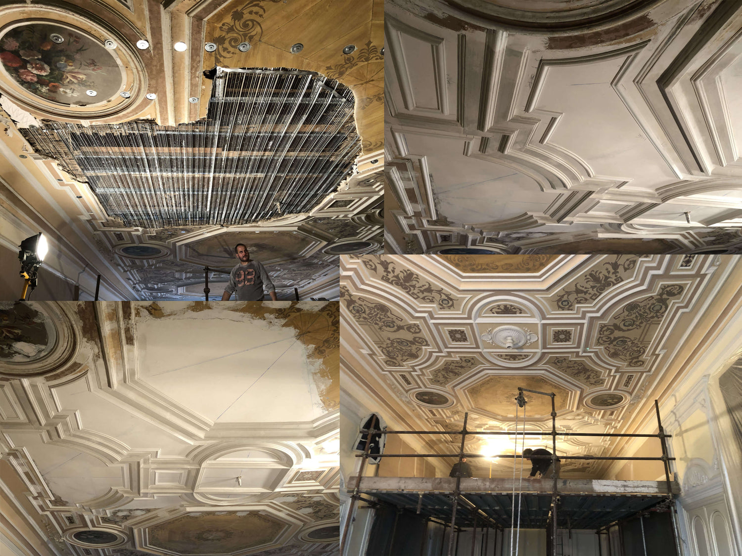 In seguito a una grave infiltrazione d'acqua, il solaio di un locale storico ha subito un crollo parziale, provocando danni significativi alle pregiate decorazioni in gesso del soffitto.